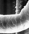 The hair to the right is the hair from the domestic cat, non glitter. The hair to the left is the glitter hair. They are not shown at the same magnification; however, you can see several things from a quick observation. One is that the glitter hair appears almost like asparagus... with triangular ridges in its shape... the hypothesis is that these ridges cause refraction of light. It is not known at this time, what is true. Only that there is a decided difference in the glitter coat and the domestic cat. |
